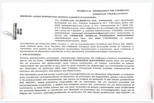 Ante los hechos judiciales que viene afrontando la cuñada del presidente de la República, Pedro Castillo, Yenifer Paredes el abogado Carlos Gil Vargas, con registro del Colegio de Abogados de Lima N°85301 presentó un recurso de habeas corpus para salvaguardar los derechos constitucionales de dicha joven, conforme el artículo 200 inciso 1 de la Constitución Política del Perú.