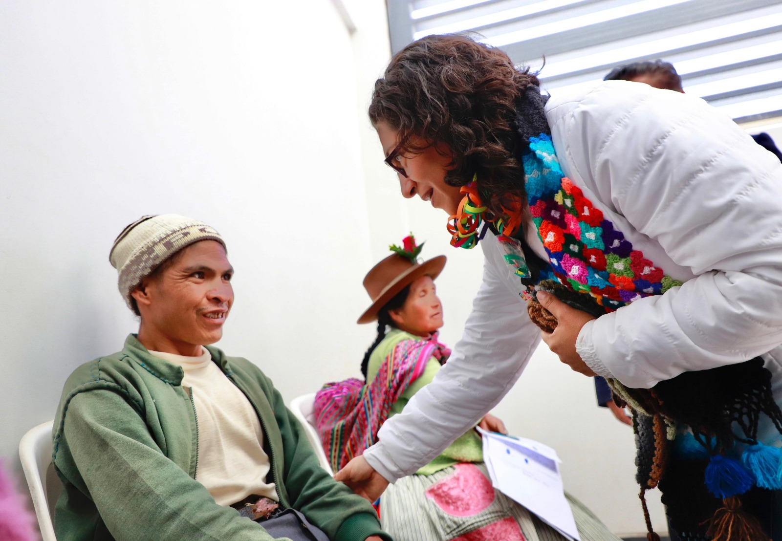 La ministra de Desarrollo e Inclusión Social, Leslie Urteaga, en el marco de sus actividades en Huancavelica, dio la bienvenida al programa Contigo a los nuevos usuarios Bruno, Benito y Juana, y los acompañó a cobrar, por primera vez, la pensión bimestral de S/300 soles, en la sede del Banco de la Nación.