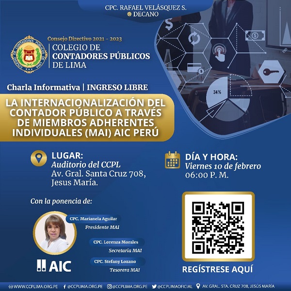 El próximo viernes 10 de febrero a las 6 pm tendrá lugar en la sede del Colegio de Contadores Públicos de Lima (Avenida General Santa Cruz 708 – Jesús María) la charla informativa titulada “La internacionalización del contador público a través de miembros adherentes individuales (MAI) AIC Perú”.